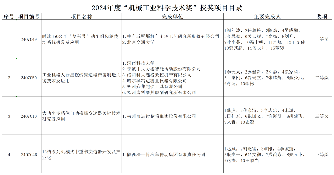 2024年12月3日,2024年度机械工业科学技术奖在重庆召开的2024装备制造业发展大会上举行了隆重的颁奖仪式。共表彰奖励项目430项,其中,特等奖5项、一等奖40项、二等奖197项、三等奖188项。在本行业单位的努力下,共4项榜上有名。其中,科技进步奖二等奖2项,三等奖2项。由中车戚墅堰机车车辆工艺研究所股份有限公司、北京交通大学完成的“时速350公里‘复兴号’动车组齿轮传动系统研发及应用”和河南科技大学、宁波中大力德智能传动股份有限公司、洛阳科大越格数控机床有限公司、哈尔滨精达测量仪器有限公司、郑州众邦超硬工具有限公司、郑州磨料磨具磨削研究所有限公司完成的“工业机器人行星摆线减速器精密制造关键技术及应用”获得科技进步奖二等奖。由杭州前进齿轮箱集团股份有限公司完成的“大功率多档位自动换挡变速器关键技术研究及应用”、陕西法士特汽车传动集团有限责任公司完成的“13档系列机械式中重卡变速器开发及产业化”获得科技进步奖三等奖。